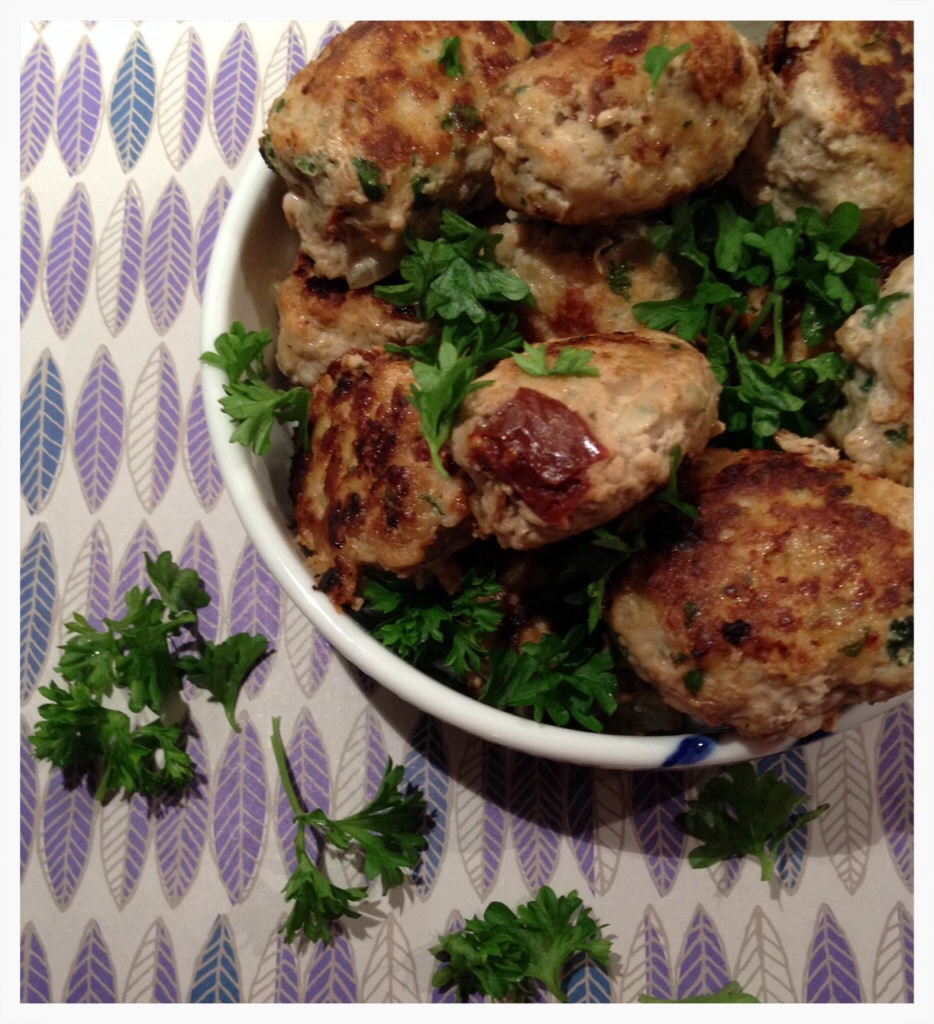 Jeg kan ret godt lide noget så enkelt som frikadeller – både de helt klassiske eller som her, hvor de er peppet lidt op. Det er så nemt at lave og kan spises med meget forskelligt tilbehør. Disse blev nydt med en grøn, sprød salat og hjemmebagt brød. Opskrift: 500 g svinefars 1 løg 2 fed presset hvidløg (kan udelades) 1 dl hakkede soltørrede tomater 2 spsk hakket persille 1 dl vand 1 spsk mel 1 æg salt og peber Olie til stegning Hak løget fint. Bland farsen med samtlige ingredienser og lad den trække i køleskabet i en halv time. Form til frikadeller og steg dem i olie på en pande.