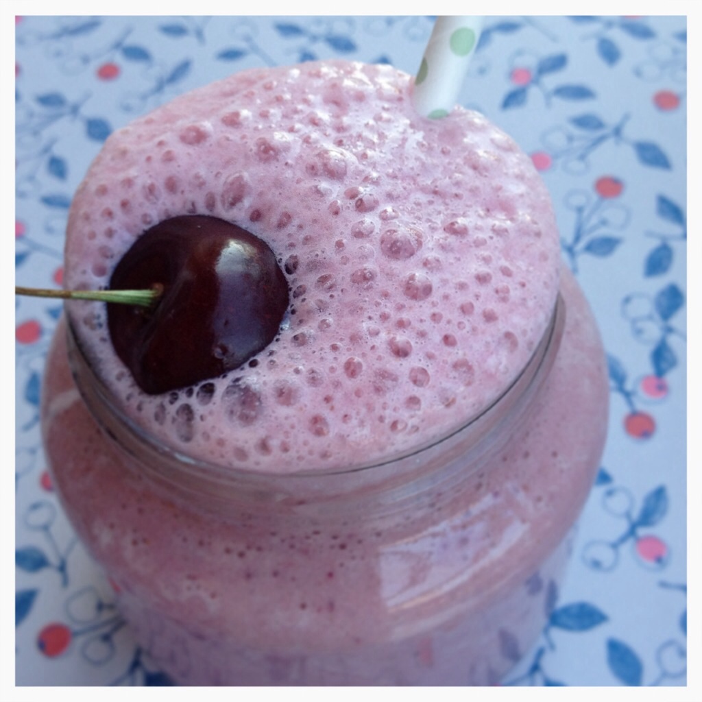 Som de fleste andre nyder jeg sommervarmen i øjeblikket med kølende læskedrikke. Man kan jo lige så godt benytte sig af sommerens lækre søde og sunde fristelser – her her jeg brugt kirsebær og jordbær. Smoothien minder mig lidt om en god italiensk amarena is, mums!