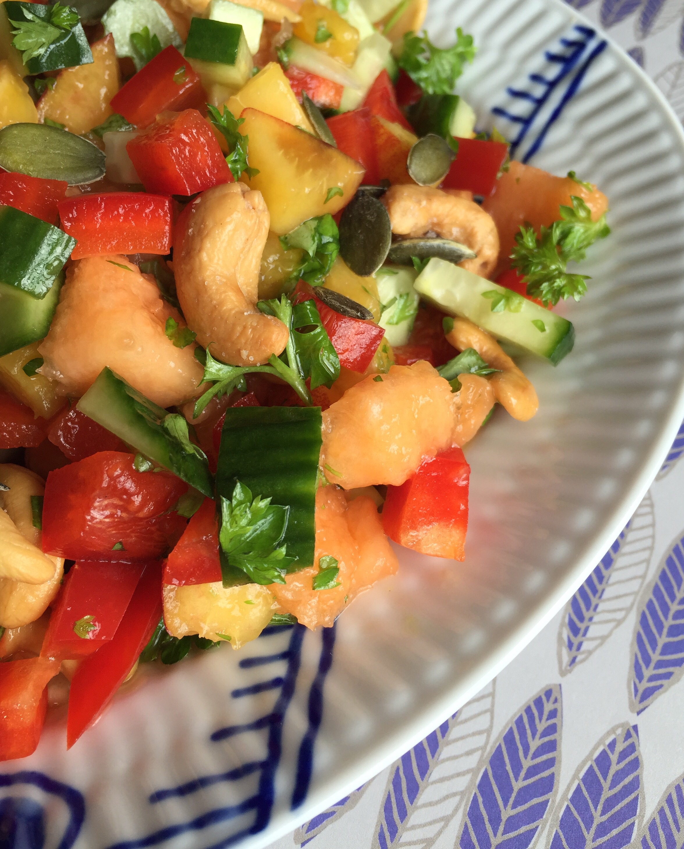 Skær frugt og grønt i små tern og bland med hakkede krydderurter og dressing. Drys med cashewnødder og græskarkerner.