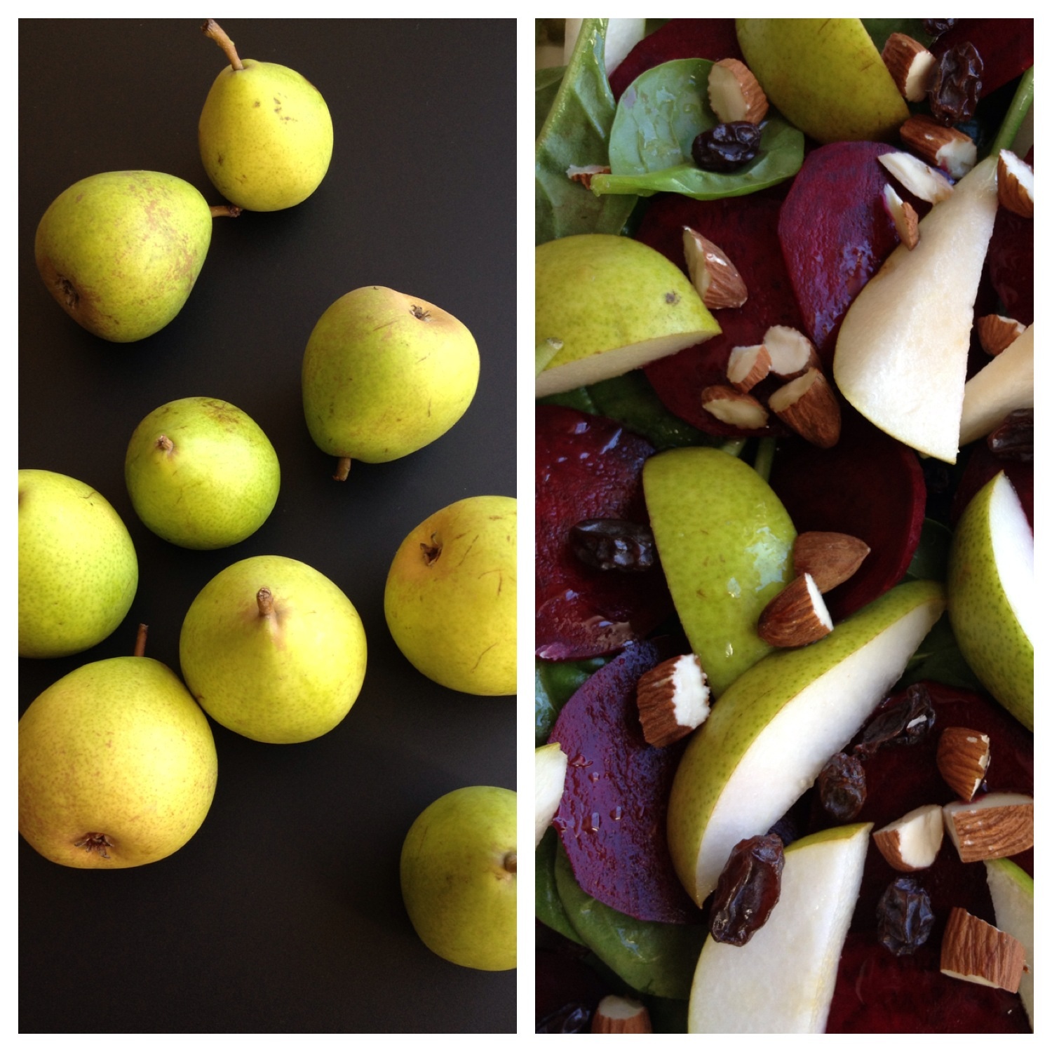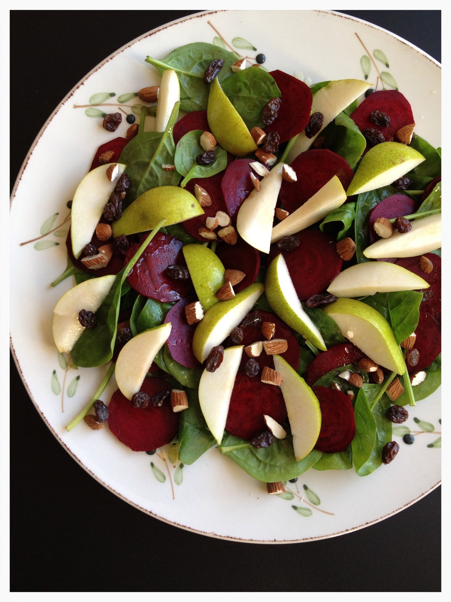 Skyl spinaten og fordel den på et fad. Skræl og snit rødbeden i meget tynde skiver. Skær pærerne i både. Fordel rødbedeskiverne og herefter pærerne over spinaten. Rør en dressing sammen af citronsaft, olie, salt og peber og hæld den over salaten. Drys til sidst mandler og rosiner på toppen.