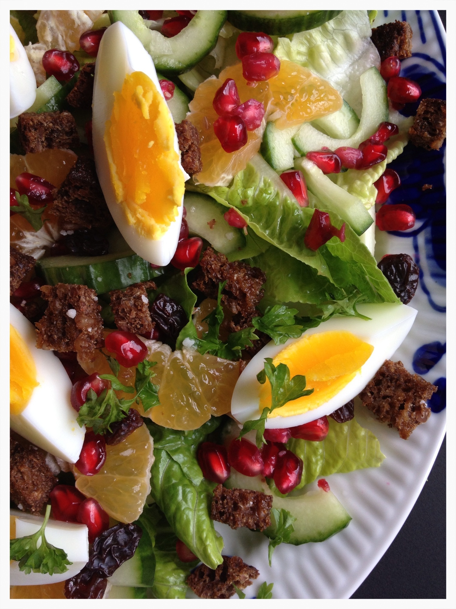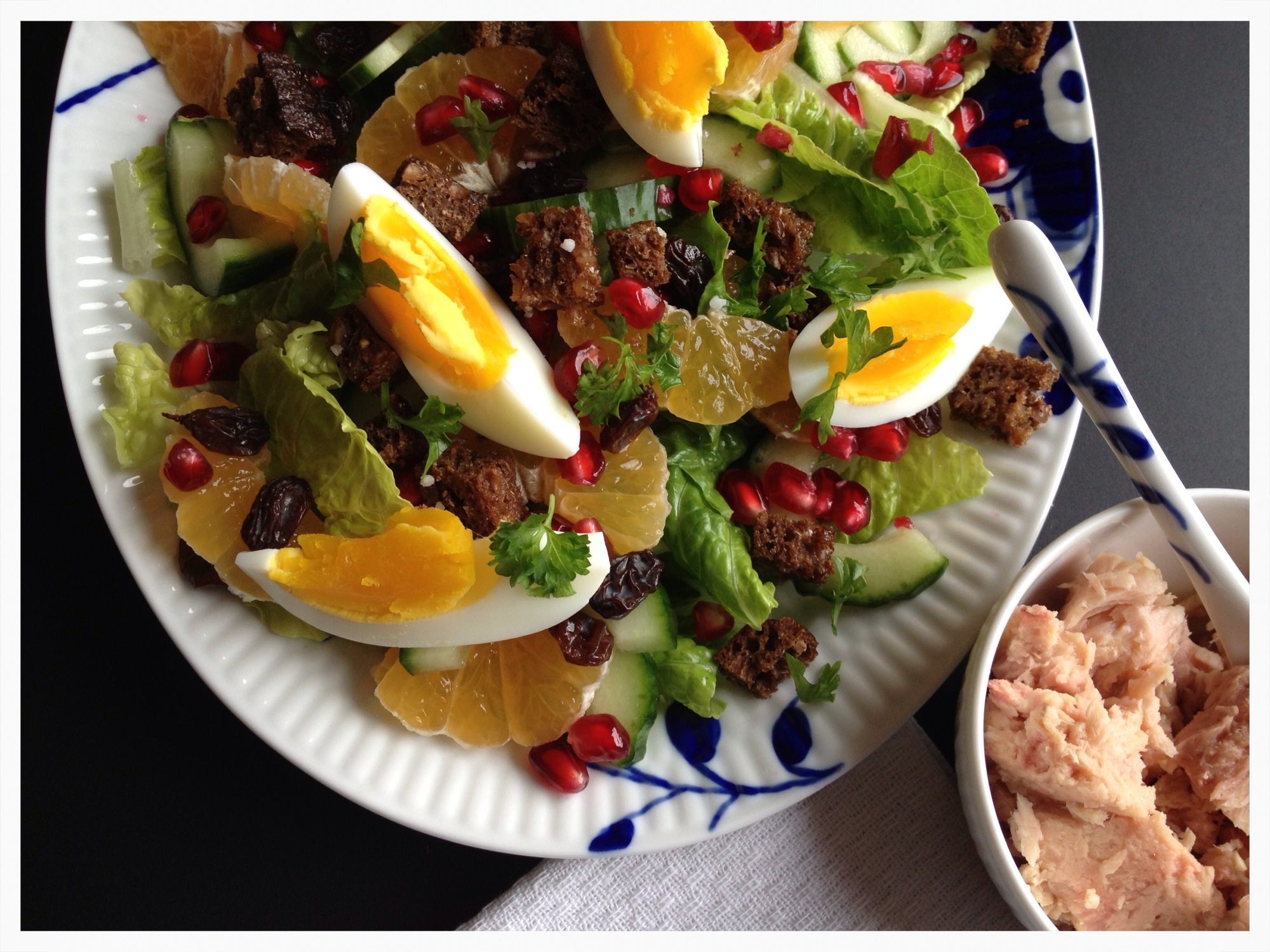 Tænd ovnen på 200 gr. Skær rugbrødsskiven i tern og vend dem i olie samt salt og fordel dem på en bageplade med bagepapir. Rist rugbrødsternene i ovnen i ca. 10-15 min til de er sprøde. Kog æggene til de er hårdkogte, ca. 10 min, og skær dem i både. Flæk agurken på langs, skrab kernerne ud med en teske og skær agurken i skiver. Skræl klementinerne, del dem på midten og skær dem i tynde skiver. Læg salatbladene på et fad og fordel agurkeskiver, klementiner, granatæblekerne, rosiner, rugbrødstern og æg over salatbladene. Rør olie og citronsaft sammen med salt og peber og fordel dressingen over salaten og drys med persille. Server med tun.